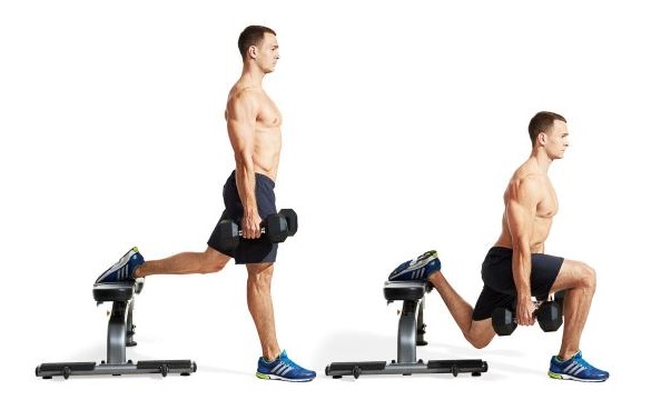 نحوهی انجام: با فاصلهی حدود ۱ متر، جلوِ پله یا سطح صافی بایستید و پای چپ را روی آن قرار دهید. میتوانید روی پنجهی پا یا روی پا بایستید. پای راست را کمی جلو بیاورید تا هنگامی که پایین میآیید، زانو پشت پنجهی پا قرار بگیرد. وزن خود را روی پای جلویی بیندازید. زانوها را خم کنید و پایین بیایید تا جایی که زانوی جلویی بهشکل زاویهی ۹۰ درجه دربیاید. با فشار روی پاشنهی جلویی برخیزید و حرکت را ۱۰ تا ۱۶ بار قبل از تعویض پا تکرار کنید.